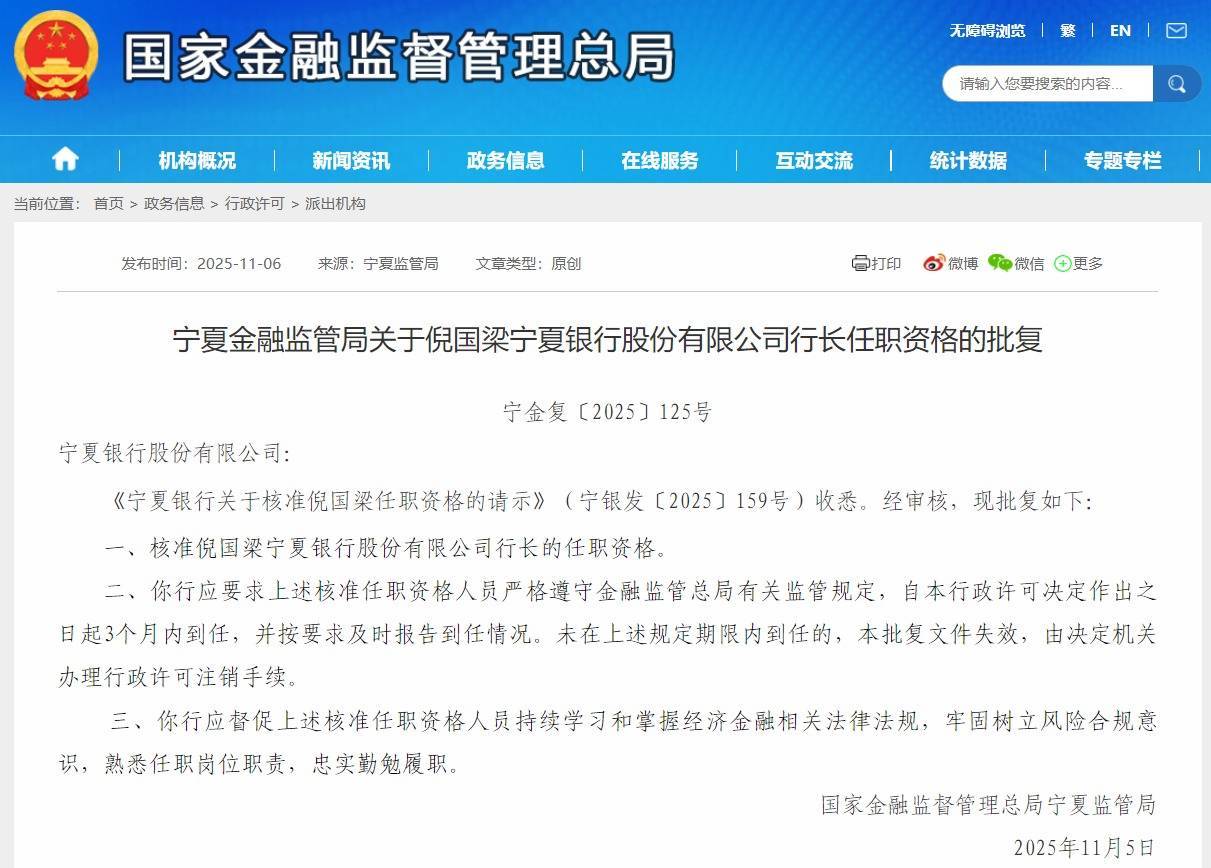【大河财立方消息】11月6日,宁夏金融监管局批复,核准倪国梁宁夏银行行长的任职资格。